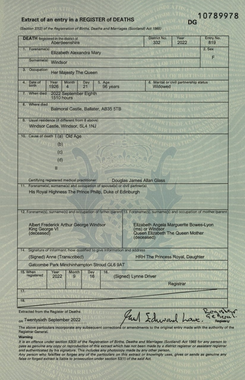 Стала известна официальная причина смерти британской королевы Елизаветы II. Документ опубликован Национальным управлением документов Шотландии.
