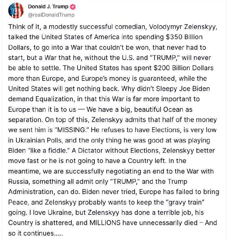 «Подумайте только: имевший скромный успех комик Владимир Зеленский убедил Соединенные Штаты Америки потратить 350 миллиардов долларов на войну, которую нельзя было выиграть, которая никогда не должна была начаться, но которую он без США и Трампа никогда не сможет урегулировать. США потратили на 200 миллиардов долларов больше, чем Европа, причем европейские деньги гарантированы, а США не получат ничего взамен. Почему же сонный Джо Байден не потребовал выравнивания, ведь эта война гораздо важнее для Европы, чем для нас — у нас есть большой, красивый океан, который нас отделяет. Кроме того, Зеленский признает, что половина денег, которые мы ему отправили, "ПРОПАЛА". Он отказывается проводить выборы, его рейтинги в украинских опросах очень низкие, а единственное, в чем он преуспел — это в том, чтобы "играть" на Байдене, как на скрипке. Диктатор без выборов, Зеленскому лучше поторопиться, иначе у него не останется страны. Тем временем мы успешно ведем переговоры о прекращении войны с Россией — что, по мнению всех, может сделать только Трамп и администрация Трампа. Байден даже не пытался, Европа не смогла принести мир, а Зеленский, вероятно, хочет, чтобы «финансовый поток» продолжался. Я люблю Украину, но Зеленский проделал ужасную работу, его страна разрушена, и миллиона погибли напрасно – и это все продолжается…» – написал Трамп.