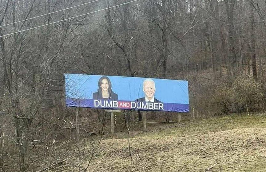 В Пенсильвании установили рекламный щит со словами «Тупой и еще тупее», на котором изображены Байден и Харрис
